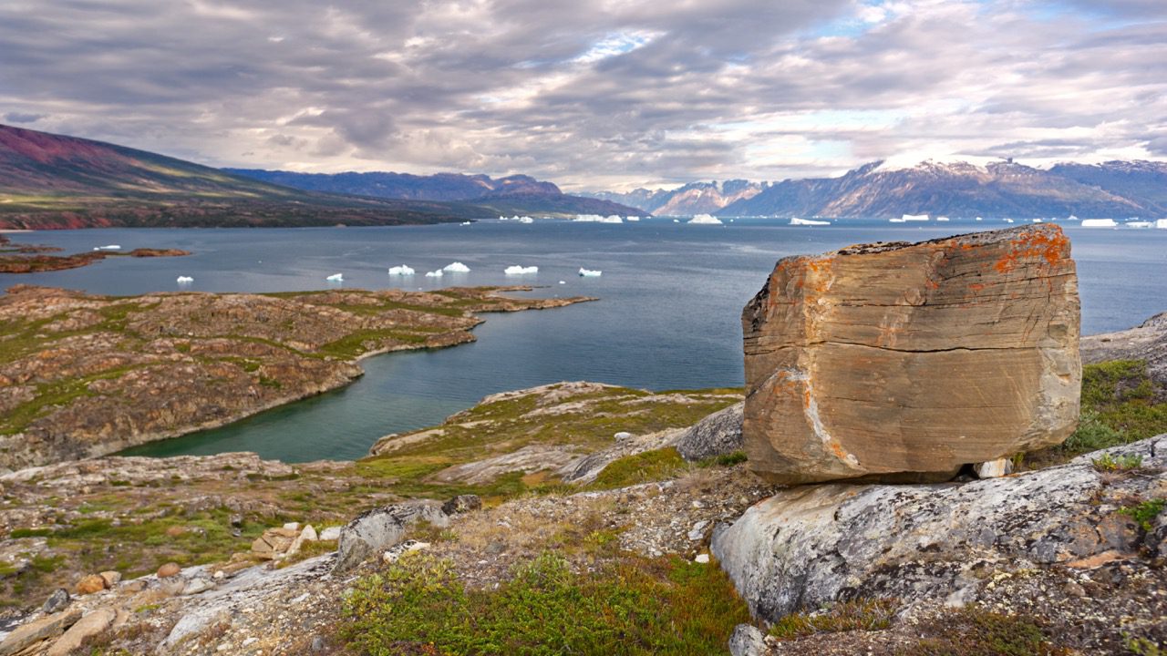An der flachen Küste um unseren Ankerplatz sprießen Beerensträucher und Moose zwischen den Steinen. Sumpfige Wasserlachen sind im Flachland über den Permafrostboden zurückgeblieben, mit Büschen an Wollgras und Glockenblumen. Wie Findlinge liegen große Felsbrocken in der Landschaft verstreut.