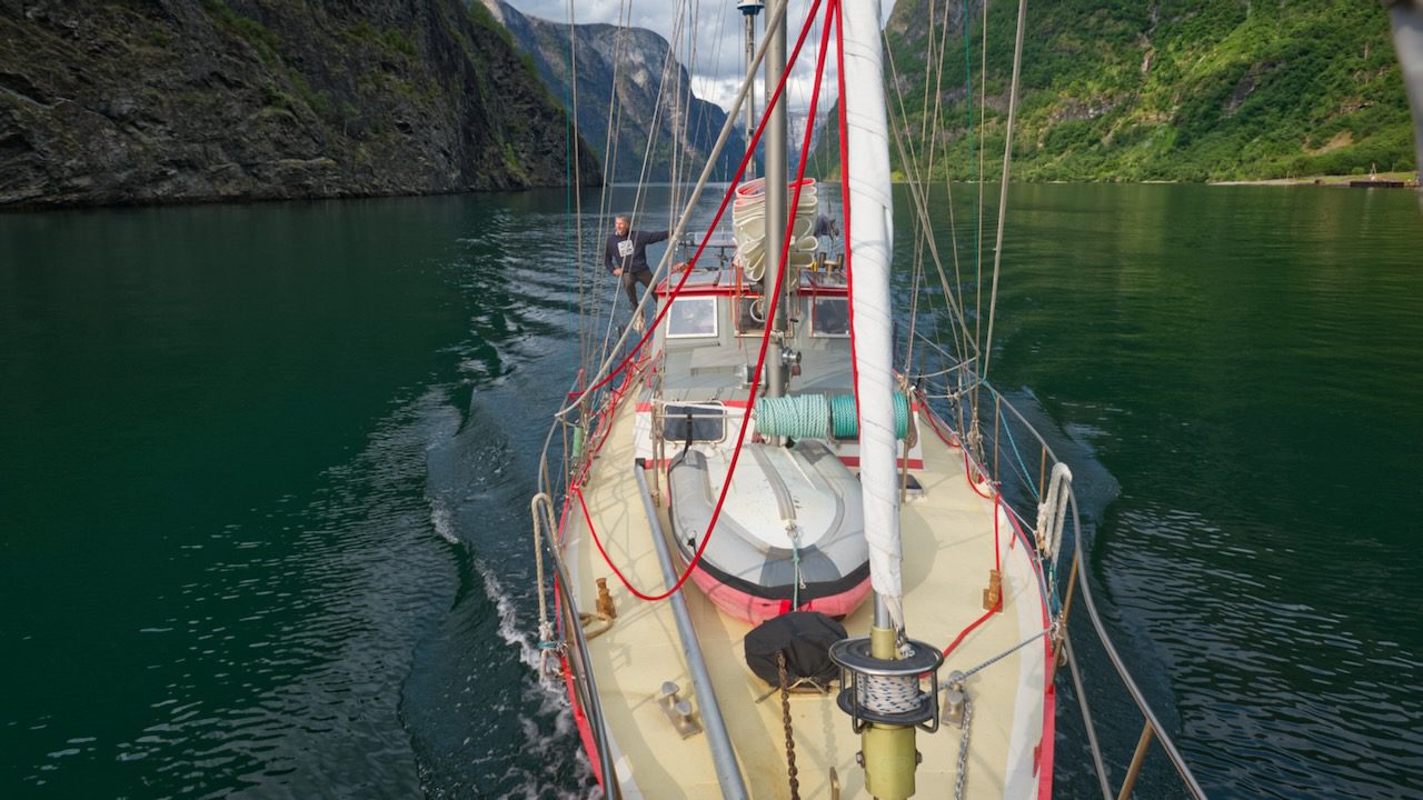 Wir haben Glück – oder besser gesagt Wind. Eine frische Brise schiebt uns immer tiefer in den Fjord. Bleibt achterlich, egal, welchen Kurs die nächste Biegung im Fjord bringt. Der Wind dreht fröhlich mit und LA BELLE EPOQUE breitet ihre Segel zum Schmetterling aus.