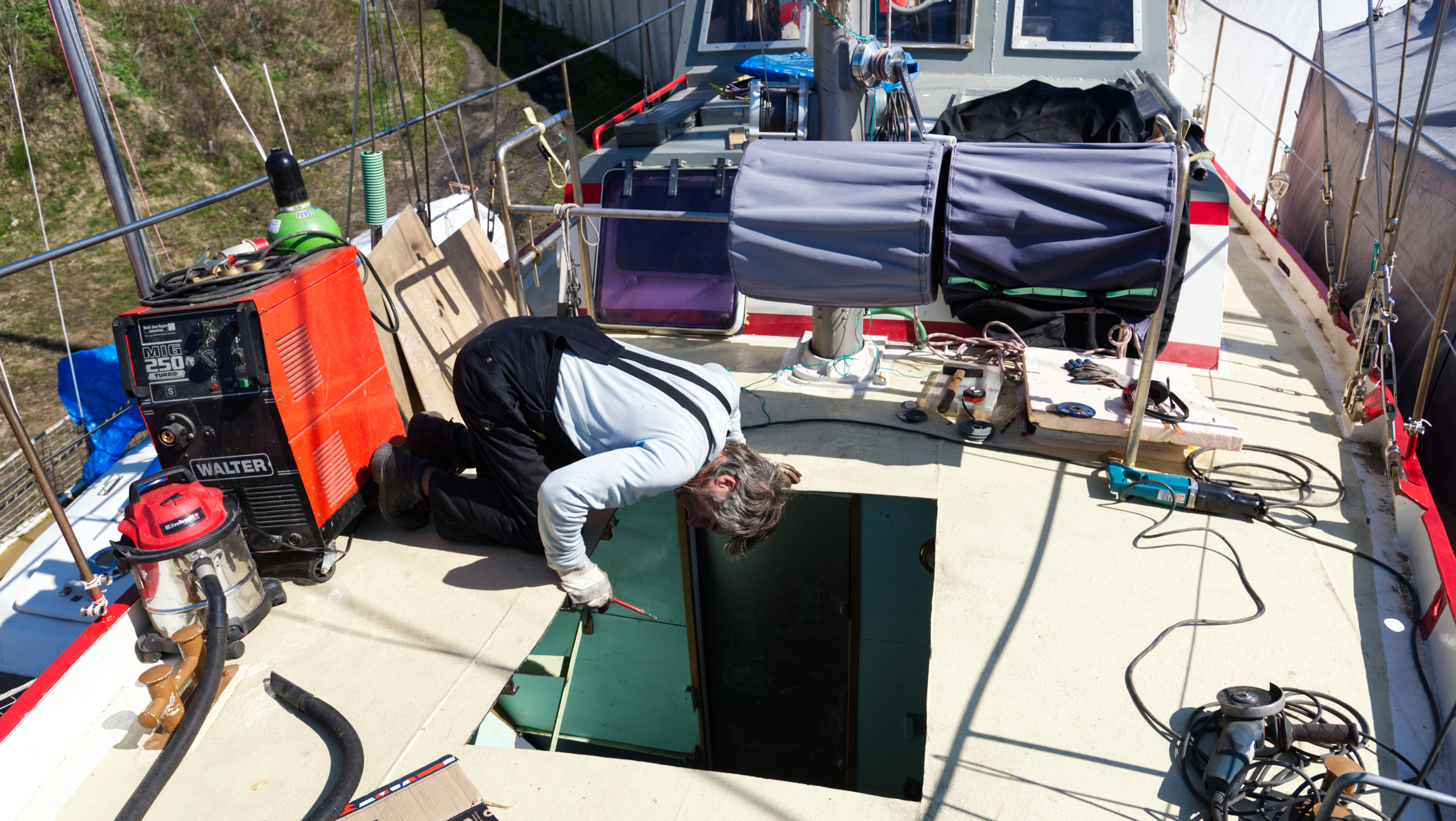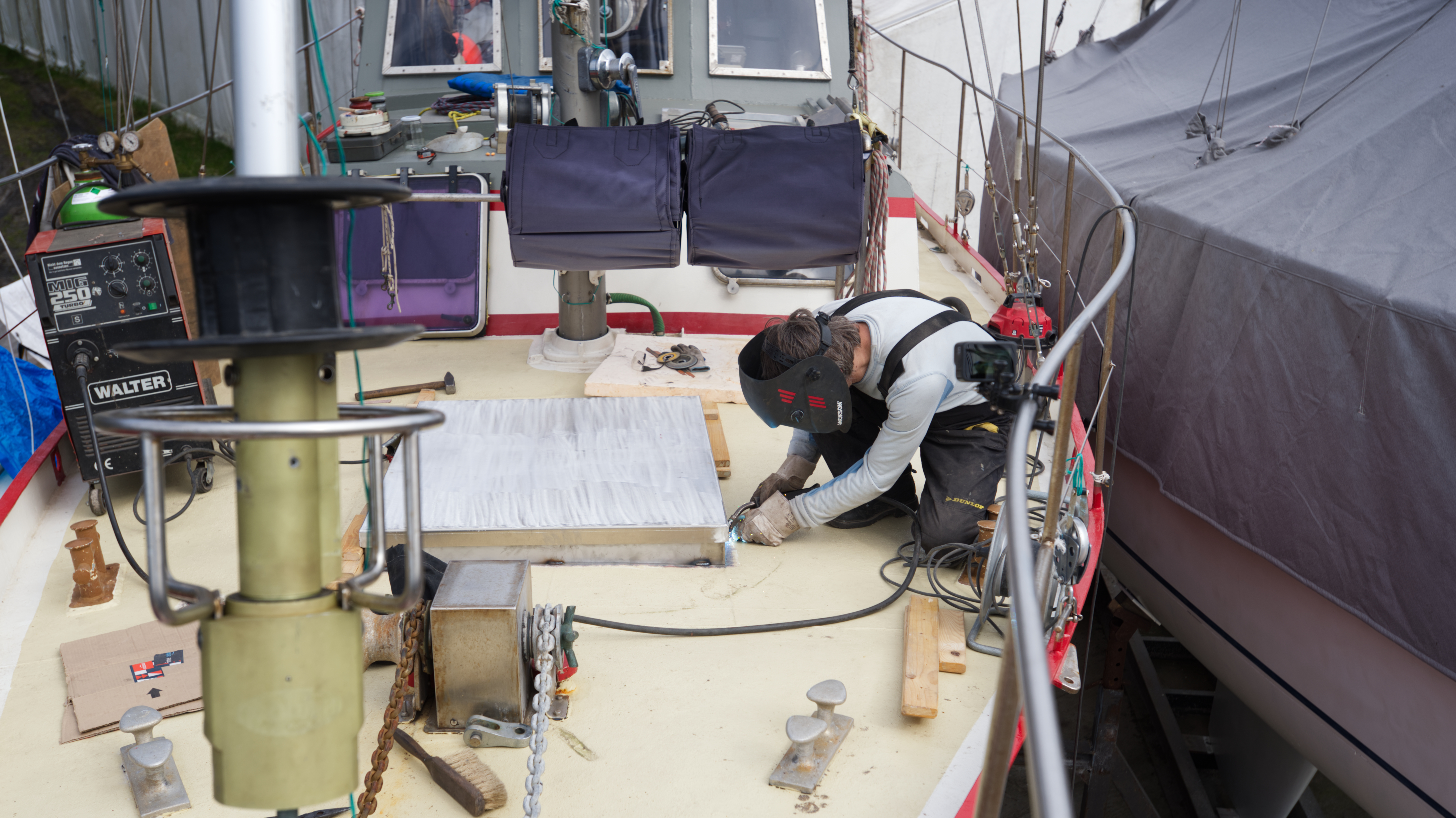 Während Jürgen den neuen Rahmen für die Ladeluke auf Deck einschweißt, entroste ich den Ankerkasten. Der sollte in Zukunft etwas kleiner werden und mit selbstgebauten Edelstahlwannen ausgestattet werden.