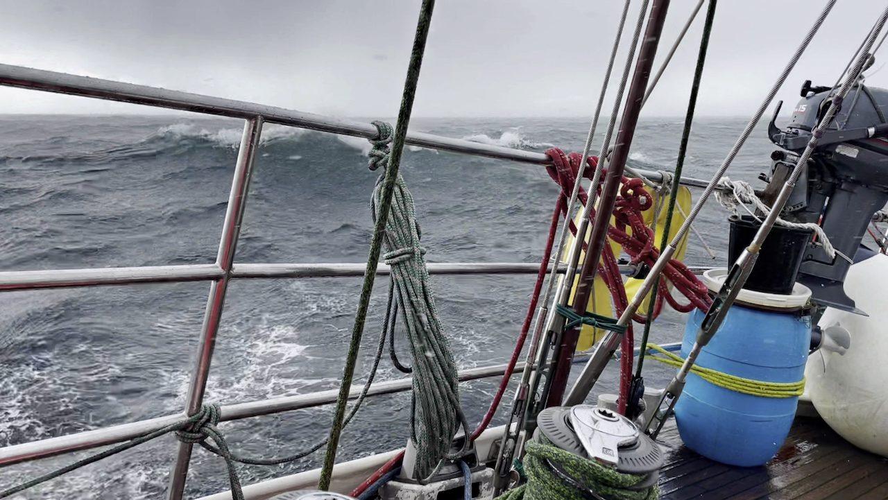 Dann haben wir den letzten Schutz durch Land hinter uns gelassen. Steile Graubärte rollen auf uns zu, glänzen metallisch unter kaltem, grauen Himmel. Drei Schwestern werfen die große Yacht wie Spielzeug umher. Der Wind ist schneidend kalt, immer wieder ziehen Schneeschauer durch. Kappsturmvögel spielen über der Gischt.