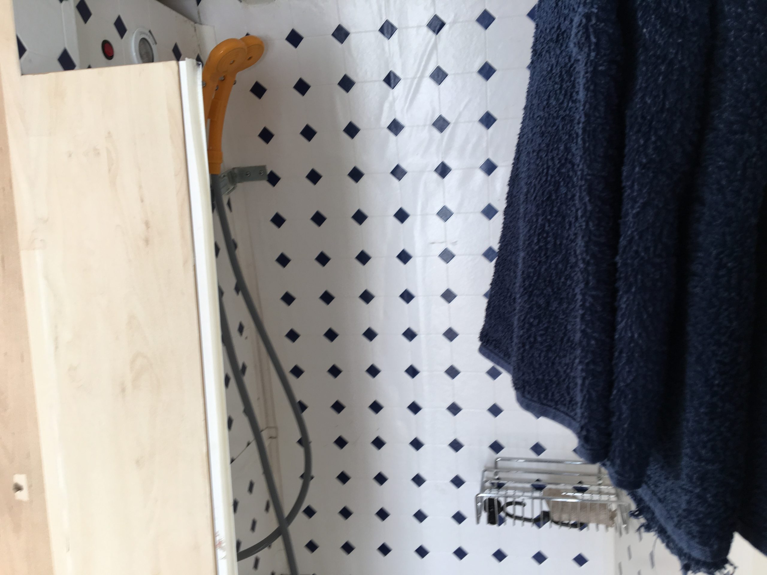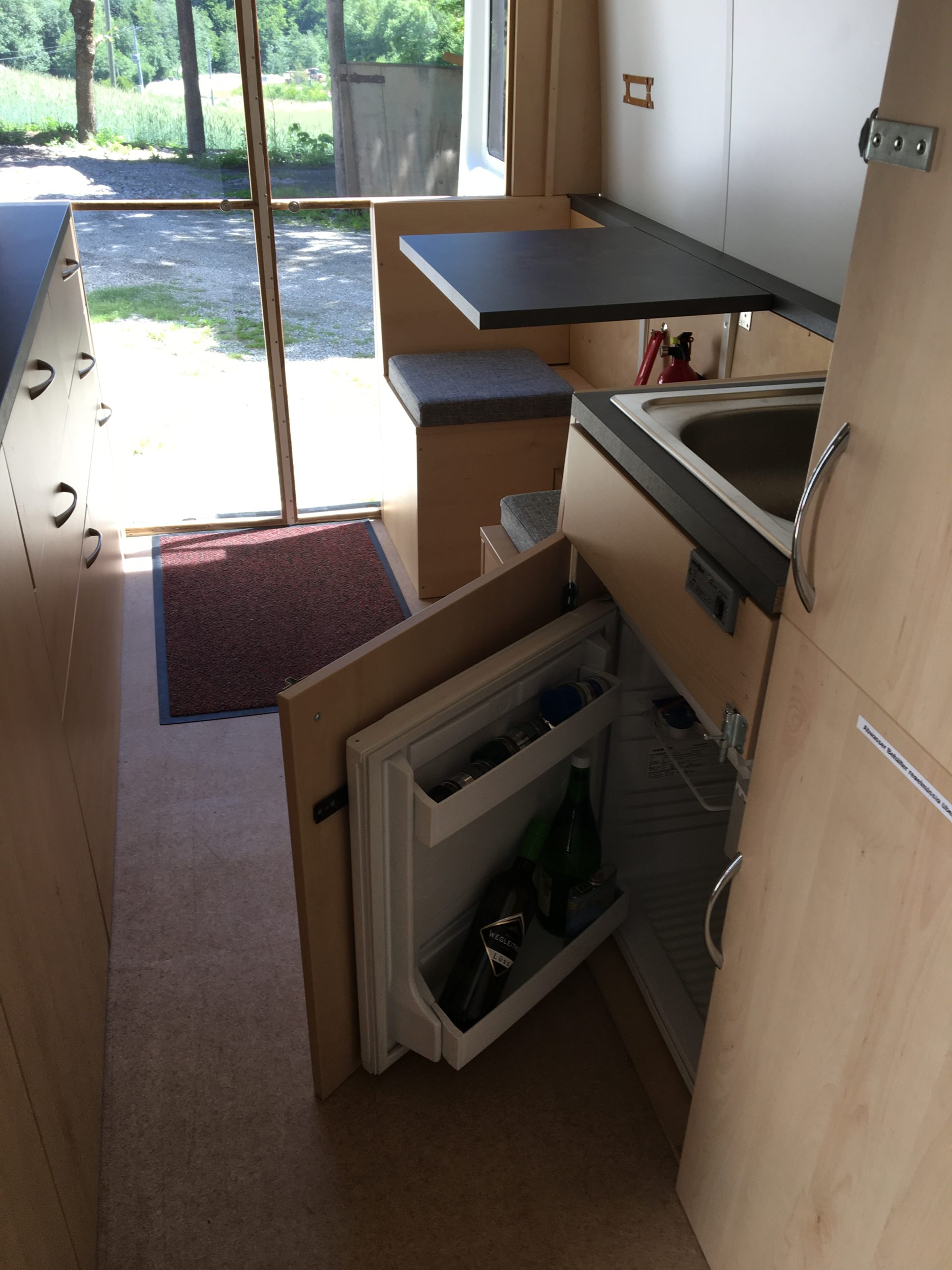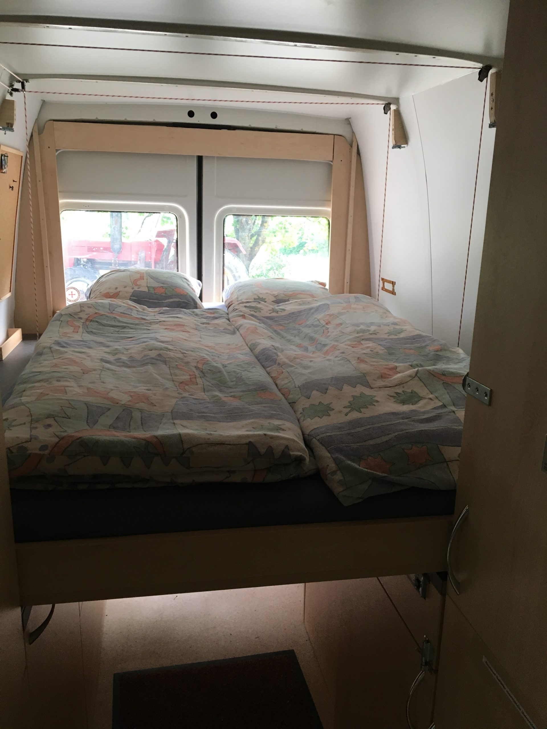 Das geniale am Camper-Kastenwagen ist innen zu finden: Um den Platz möglichst gut zu nützen, hat unser Vorbesitzer eine Idee verwirklicht: er hat das Bett auf Fallen befestigt und diese auf eine Seilwinde gewickelt. Das Bett lässt sich also bis unters Dach hochziehen und offenbart Küche und Lebensraum darunter. Mit Kühlschrank und Dusche. Ein Luxus, den wir nicht mal auf unserem Schifferl haben.