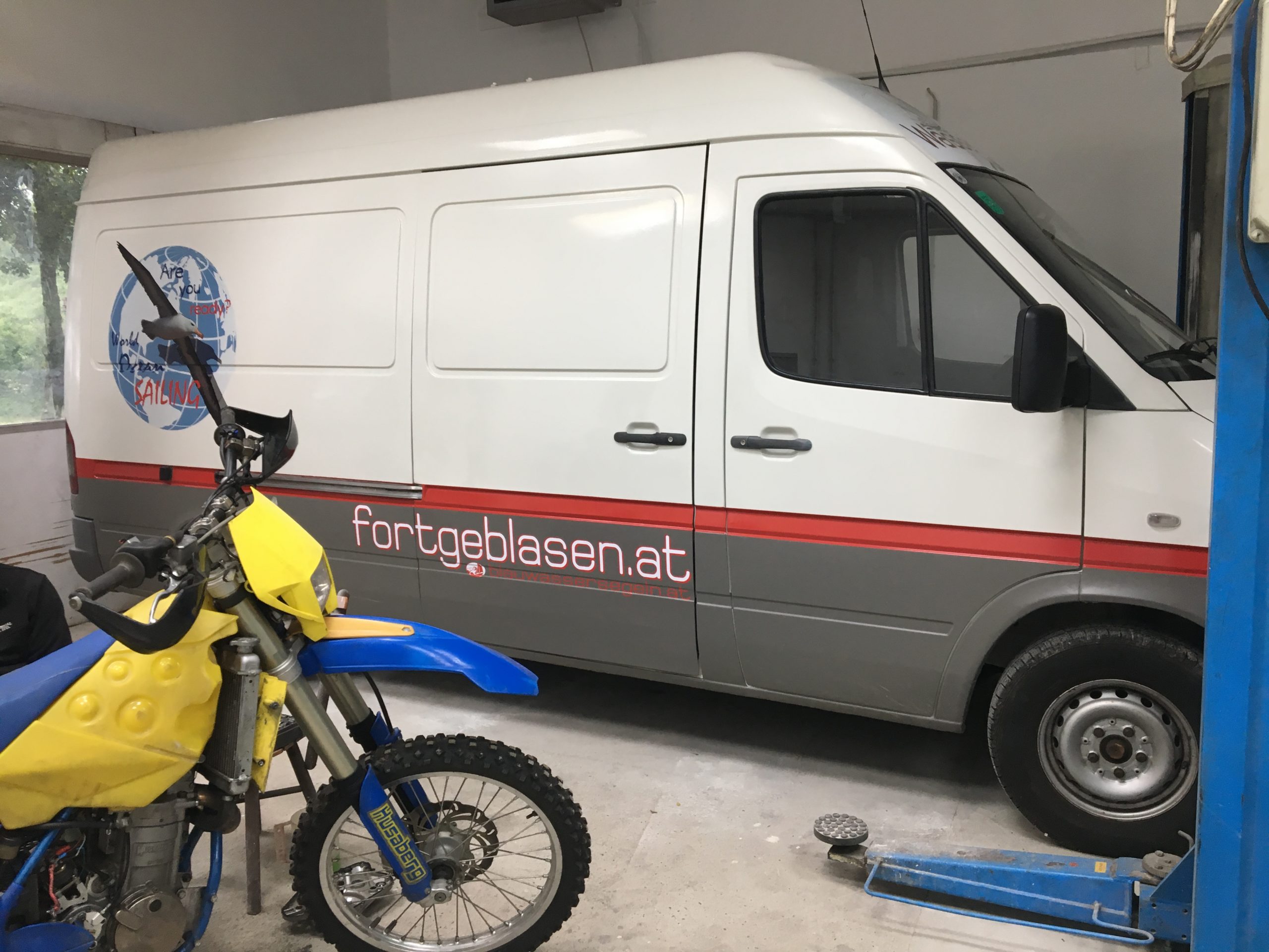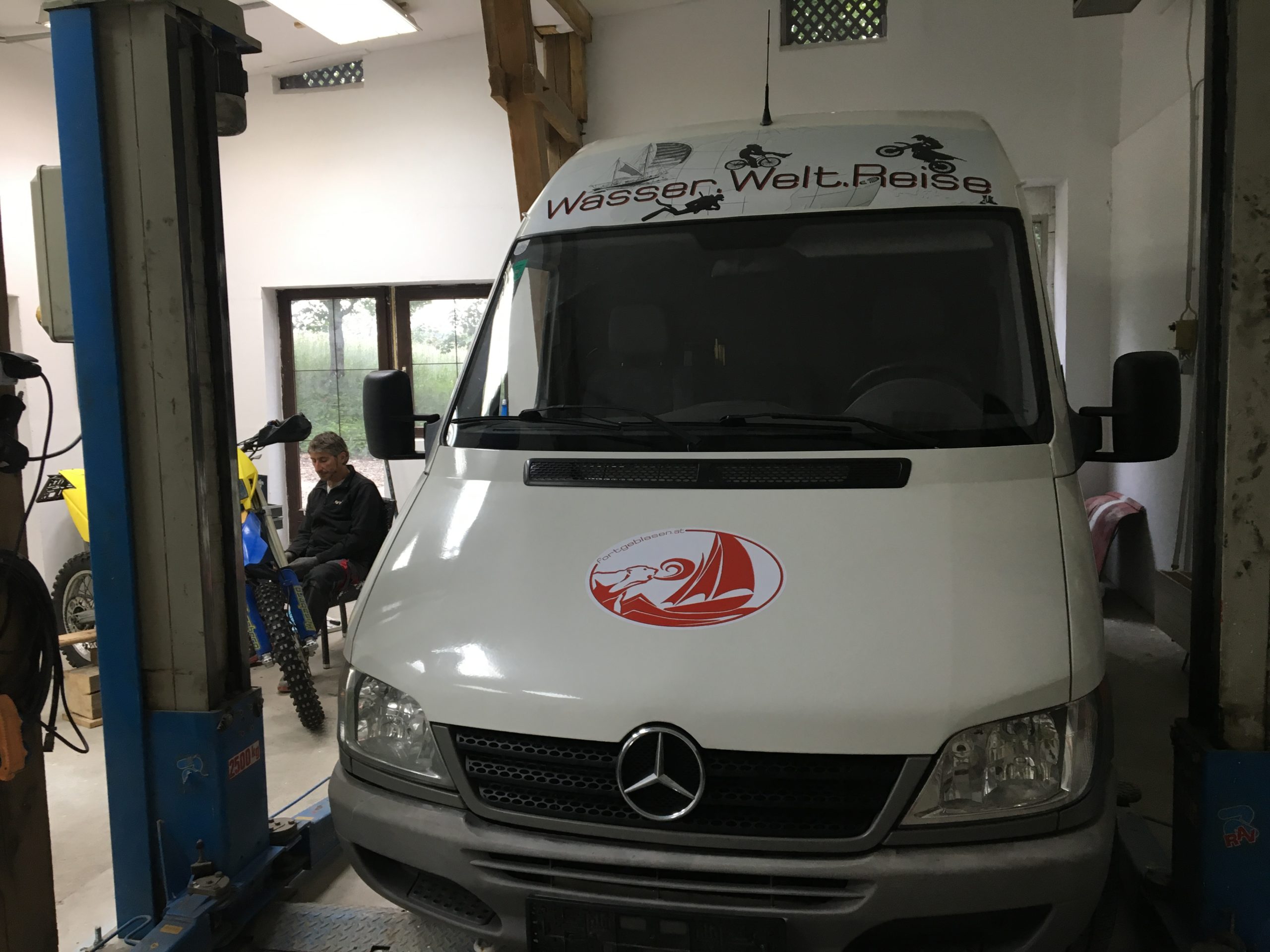Es hat nicht lange gedauert, ist uns das richtige Projekt in die Hände gefallen: ein Kastenwagen mit Tischlerausbau. Innen hell, hübsch durchdacht, aussen runtergekommen und rostig. Ein echter „Möbeltransporter“, sozusagen. Und als wir so auf einem Parkplatz in Salzburg den fleckigen Mercedes Sprinter begutachten – ich im Aufbau stehend und Jürgen unterm Auto liegend – wird schnell klar: der Herr Tischler hat zwei Händchen für einen Ausbau, und da bleibt offensichtlich kein Händchen mehr fürs Blech übrig. Aber wie kann die Geschichte schon anders gehen: Rost auf und unter einem paar Meter langem Vehikel kann uns kaum aus der Reserve locken. Immerhin besitze ich mehr Winkelschleifer als so manches Mädel Handtasche oder Stöckelschuhe hat. Über den Preis werden wir uns schnell einig und schon zieht ein Kastenwagen nach Oberösterreich.