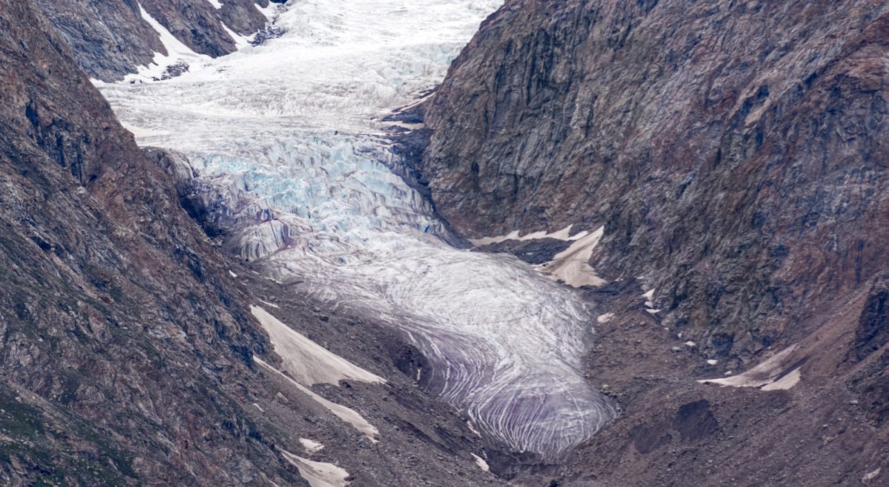 Zurückgeblieben ist freigelegter Fels, der auch ohne Gletschereis im ewigen Kampf mit Wasser langsam an Boden verliert. Jahr für Jahr dringt das Wasser in seine Ritzen und Wunden. Winter für Winter macht es sich als Eis breit und sprengt die Felsen. Frühling um Frühling bluten die Berge ihre verlorenen Felsschichten in Form von Steinschlag, Felsabbrüche und ins Tal rollenden Kiesel.
