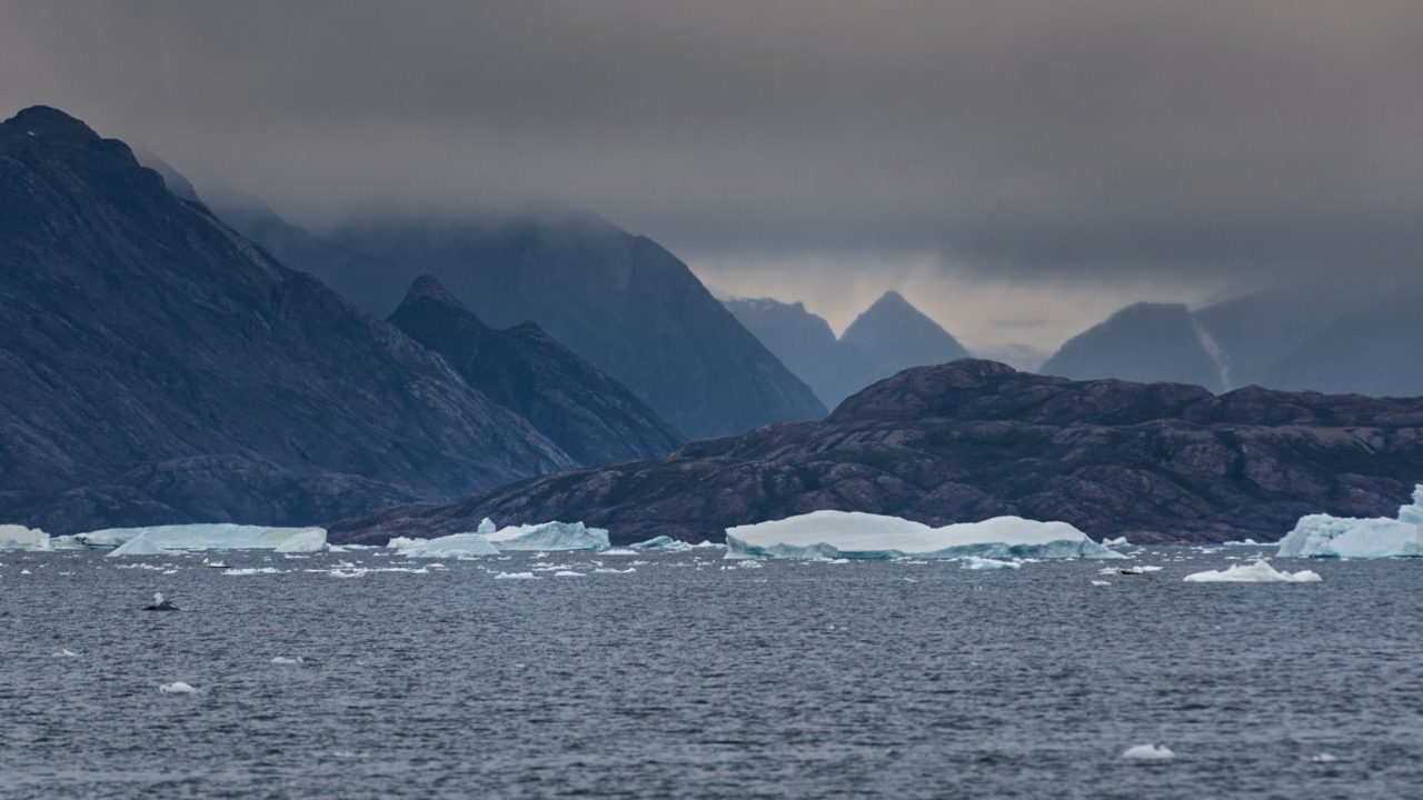 Eine Szene, eingerahmt von steilen Berghängen zu beider Uferseiten. Berge, die mit mächtigen Schneefeldern gekrönt sind. Es ist die Eiskappe Grönlands, deren Ränder wir sehen.