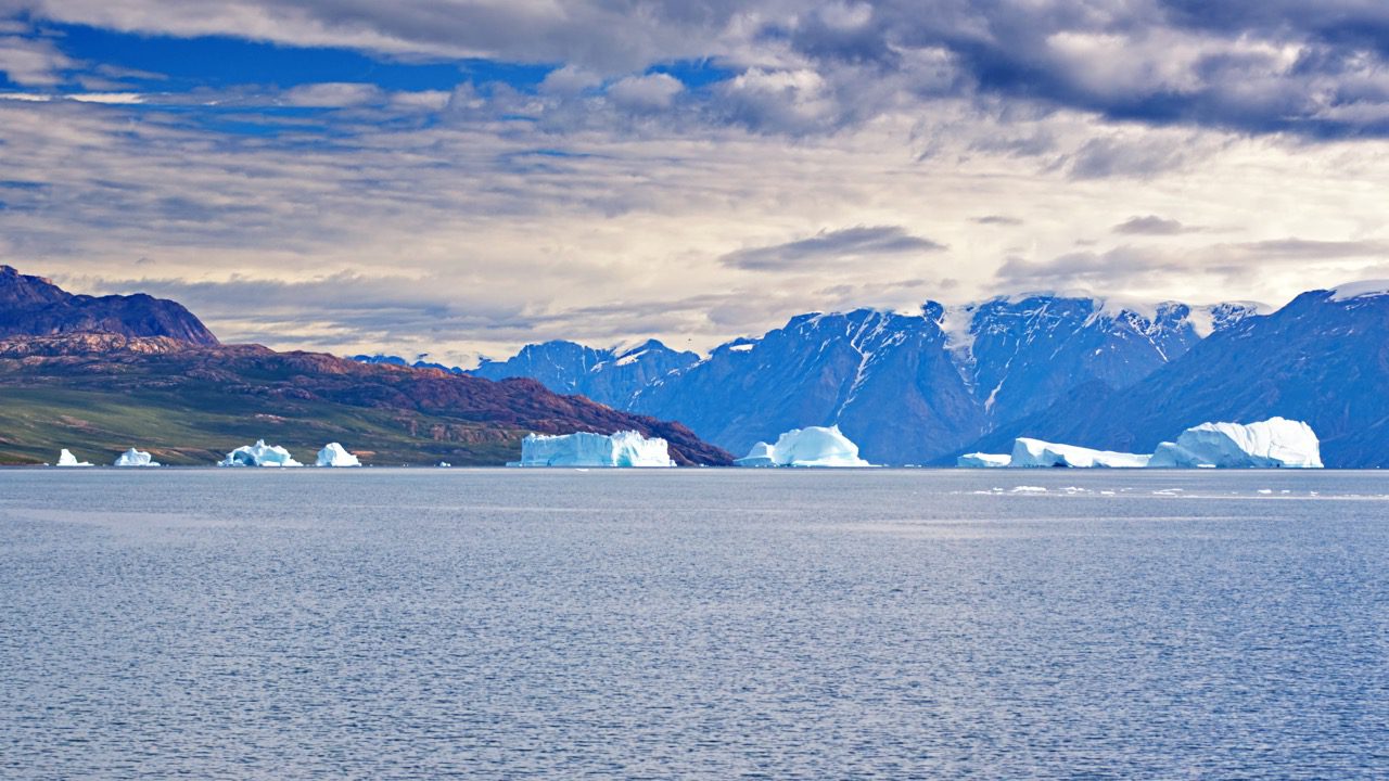 Eisberge treiben gemächlich durchs ruhige Fjordwasser hinaus in den Arktischen Ozean